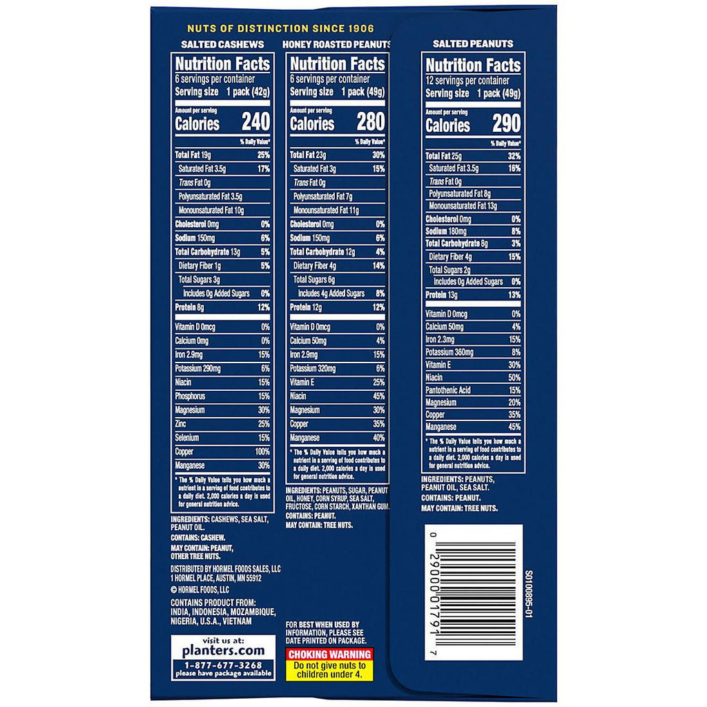 Planters Nuts Cashews and Peanuts Variety Pack Snack Nuts let you easily satisfy any craving. This multi-pack contains three flavors of delicious, crunchy roasted nuts, so there's always an option that you're in the mood for. Choose from salted cashews, salted peanuts or honey-roasted peanuts, all packaged in single-serve bags for grab-and-go snacking